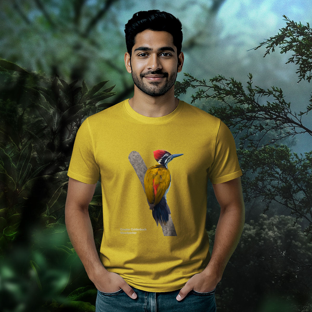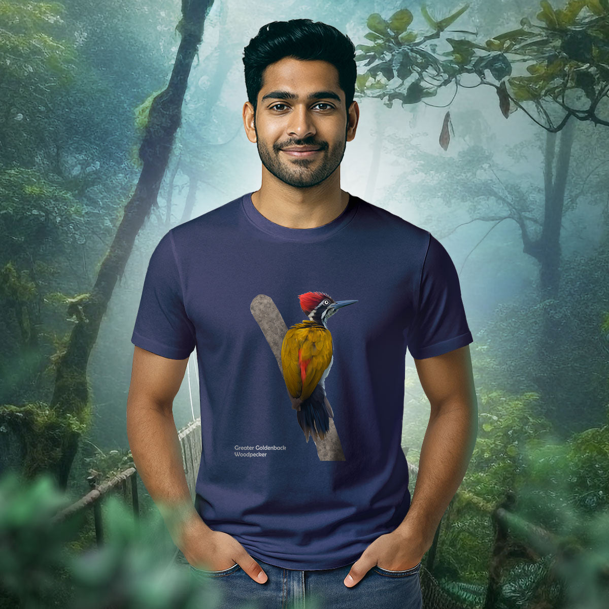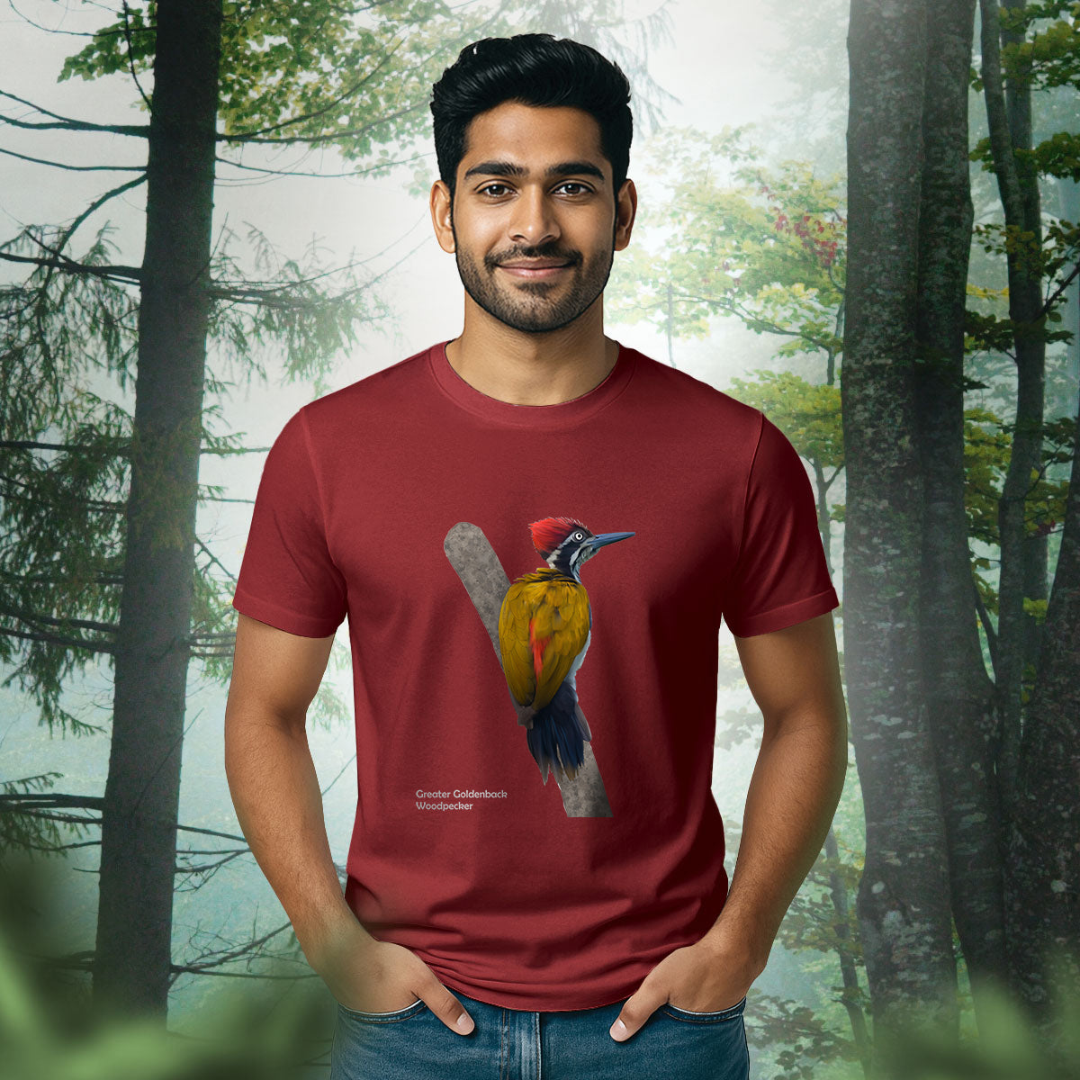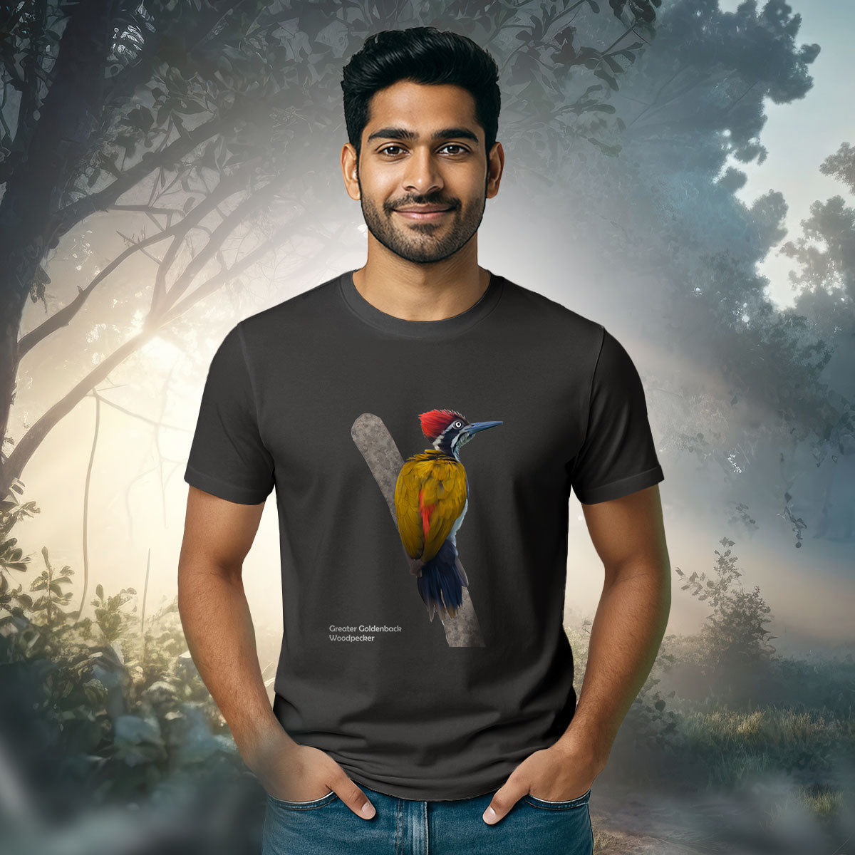 Greater Goldenback Woodpecker T-shirt, embodying the essence of the Latest Trendy Wildlife, Nature, and Bird-inspired fashion. Crafted from 100% Cotton, this Premium Quality T-shirt features a Round Neck and Regular Fit, ensuring optimal comfort and style. With its Half Sleeves and Bio Wash treatment, this shirt promises durability and softness.