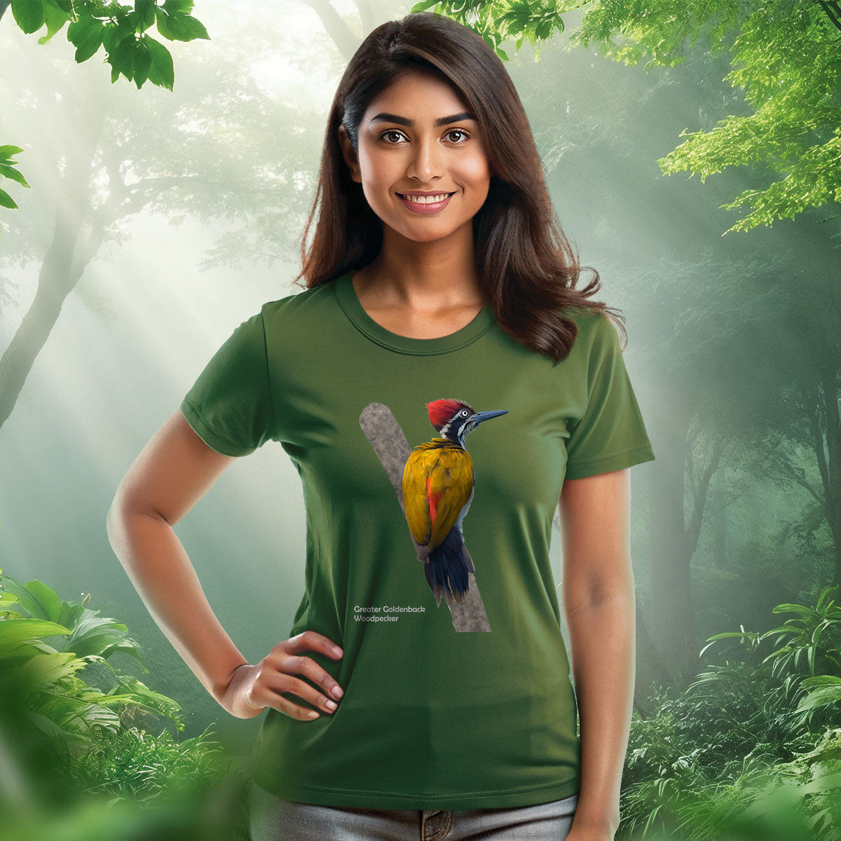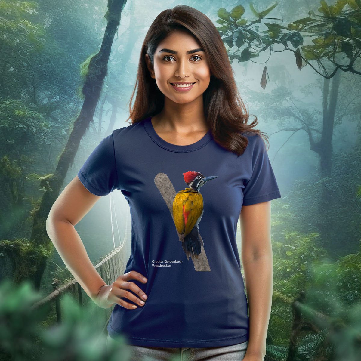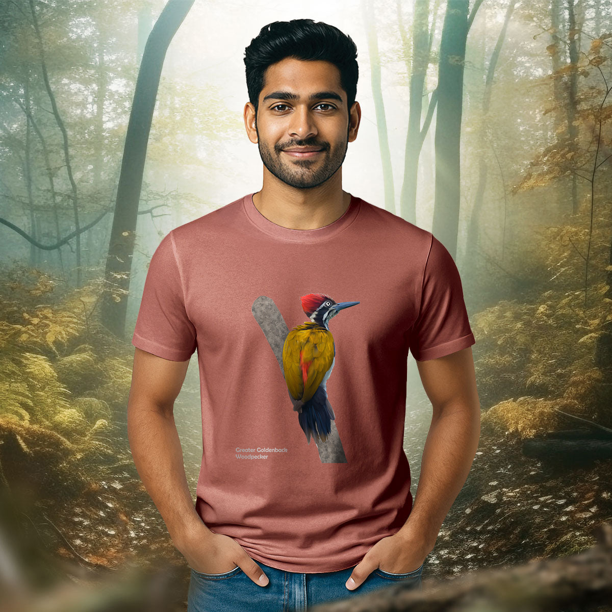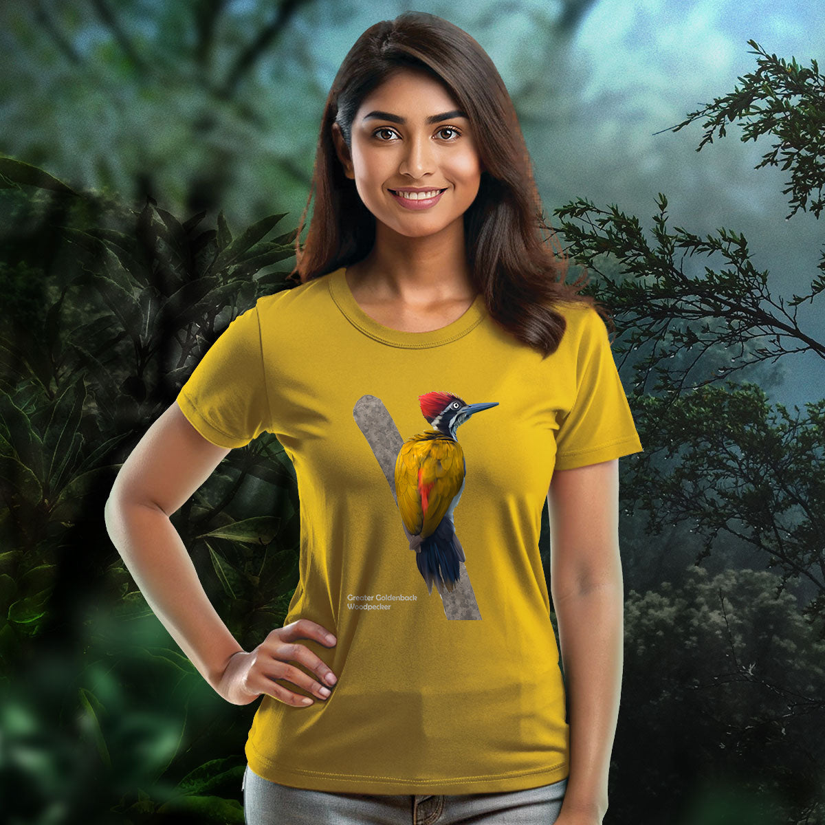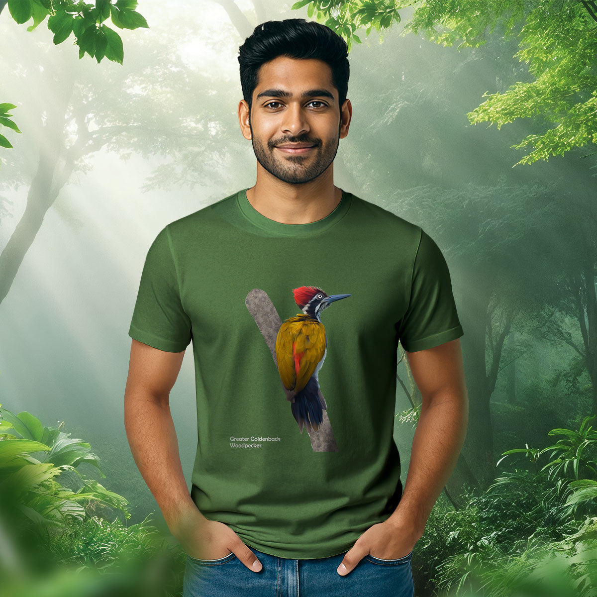 Greater Goldenback Woodpecker T-shirt, embodying the essence of the Latest Trendy Wildlife, Nature, and Bird-inspired fashion. Crafted from 100% Cotton, this Premium Quality T-shirt features a Round Neck and Regular Fit, ensuring optimal comfort and style. With its Half Sleeves and Bio Wash treatment, this shirt promises durability and softness.