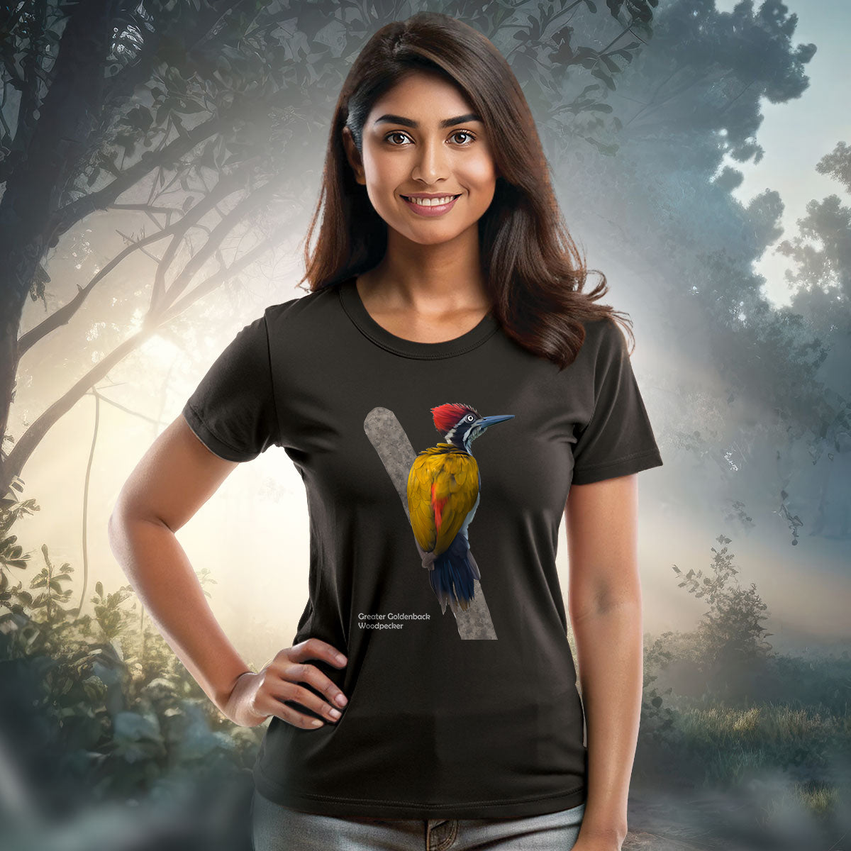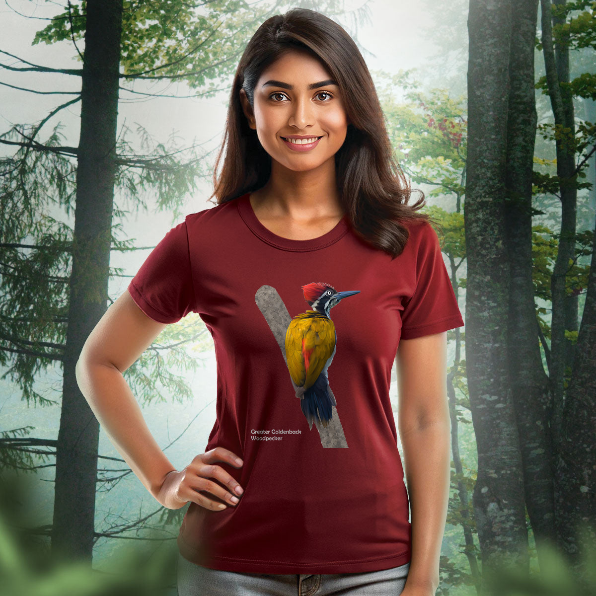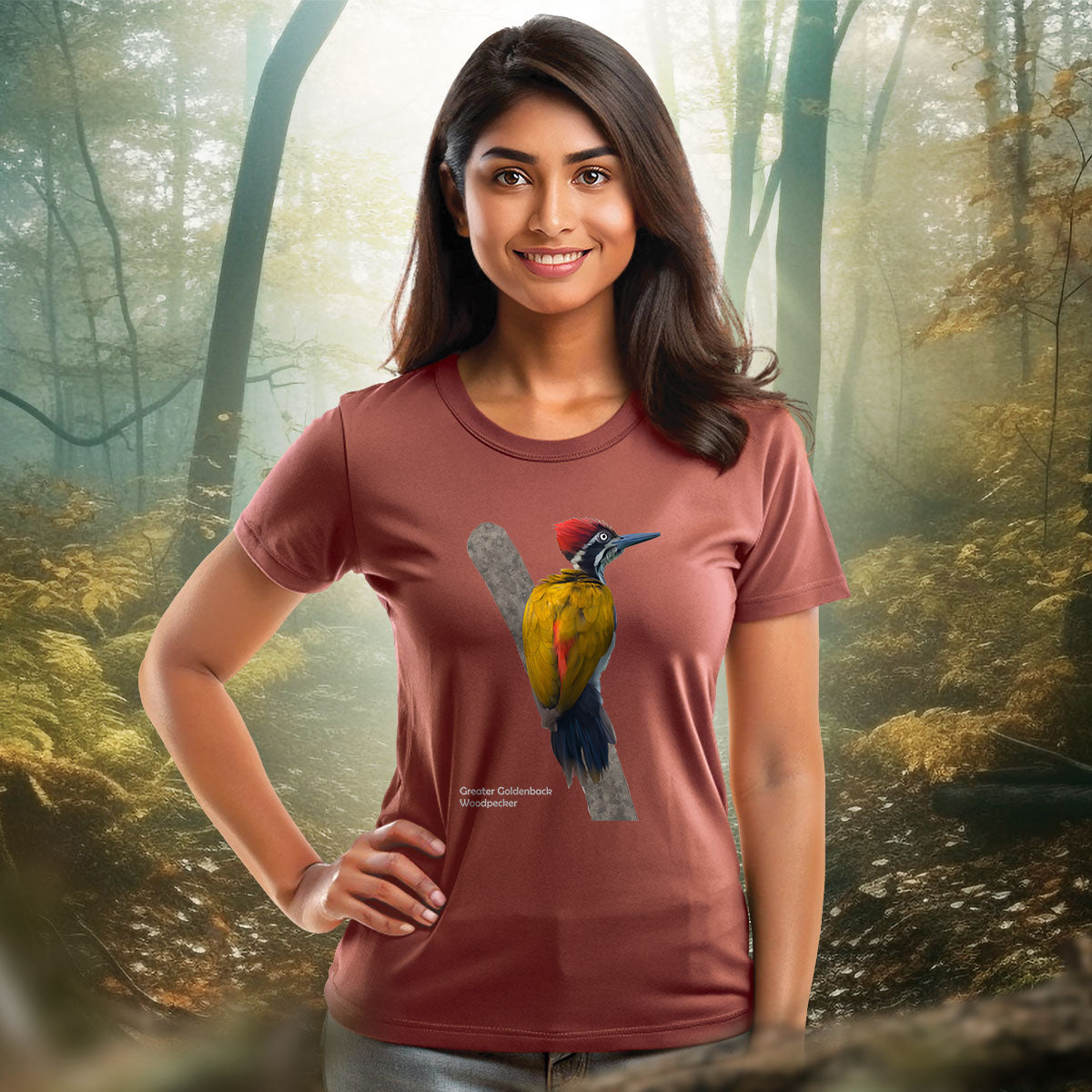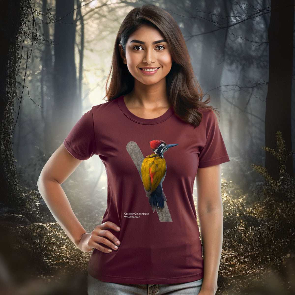 Greater Goldenback Woodpecker T-shirt, embodying the essence of the Latest Trendy Wildlife, Nature, and Bird-inspired fashion. Crafted from 100% Cotton, this Premium Quality T-shirt features a Round Neck and Regular Fit, ensuring optimal comfort and style. With its Half Sleeves and Bio Wash treatment, this shirt promises durability and softness.
